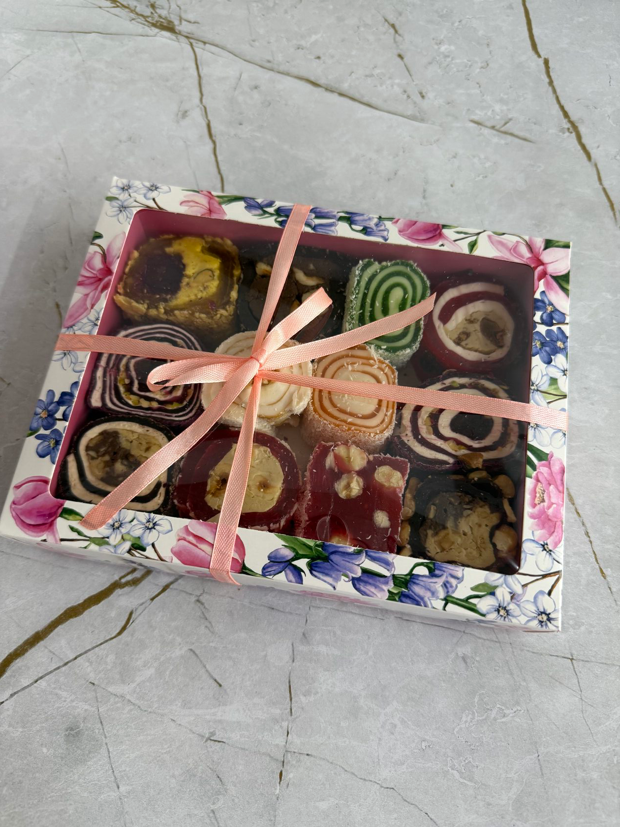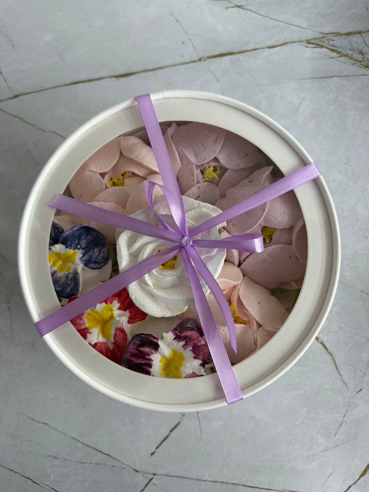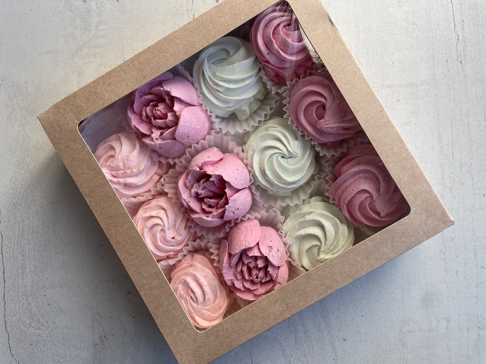 3 вкуса зефира: яблочный, брусничный и грейпфруктовый. Под каждым цветком лежит зефирный завиток, таким образом коробка заполнена зефиром до самого дна. Срок изготовления: 24 часа с момента оформления заказа.
