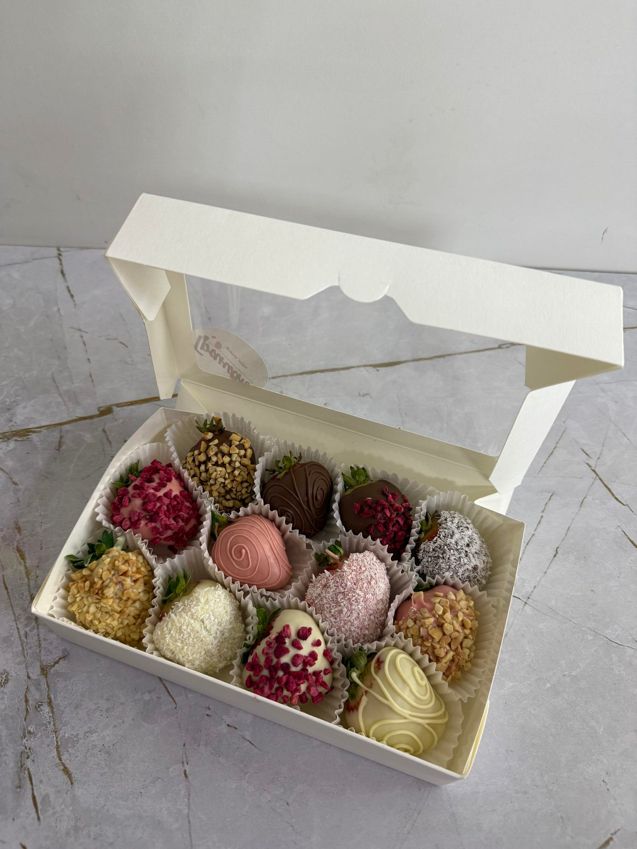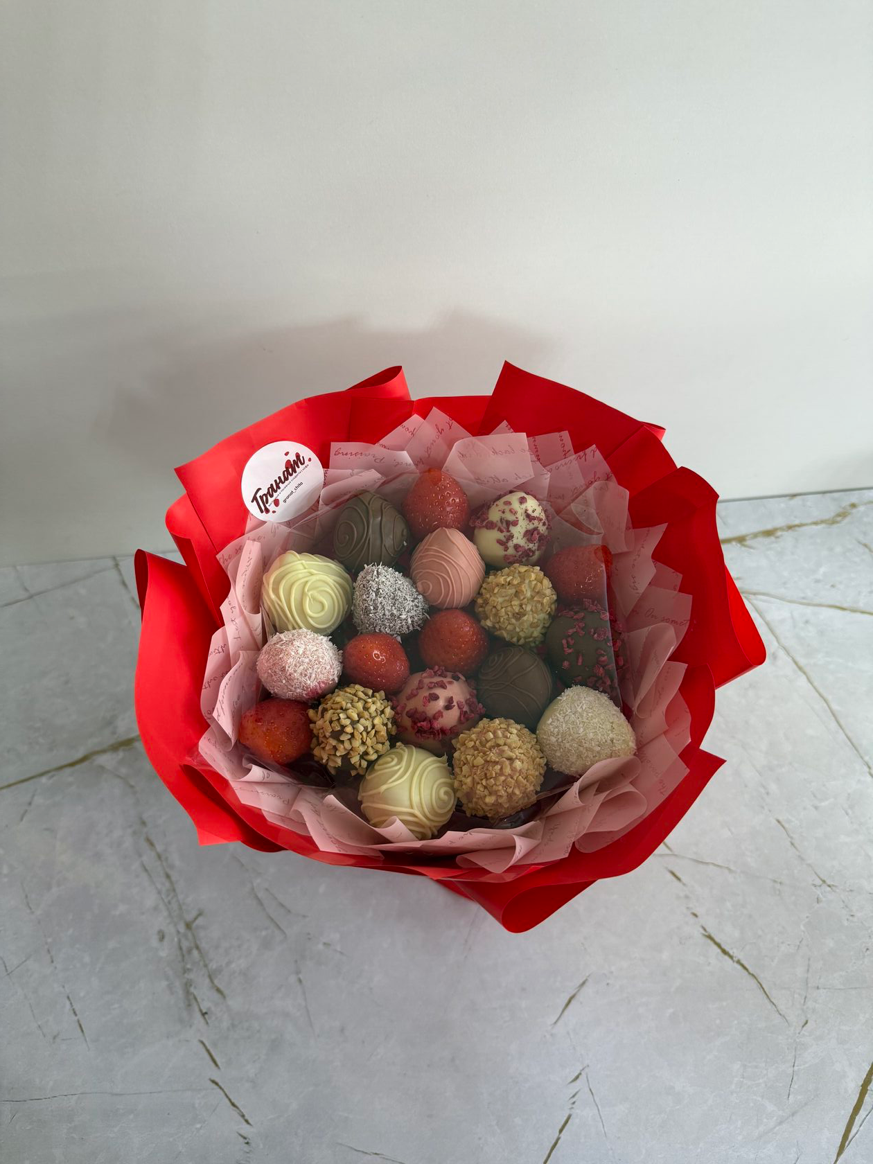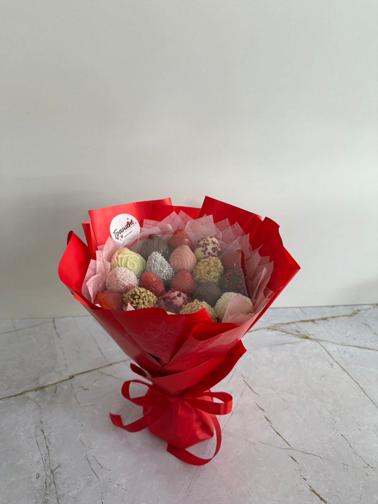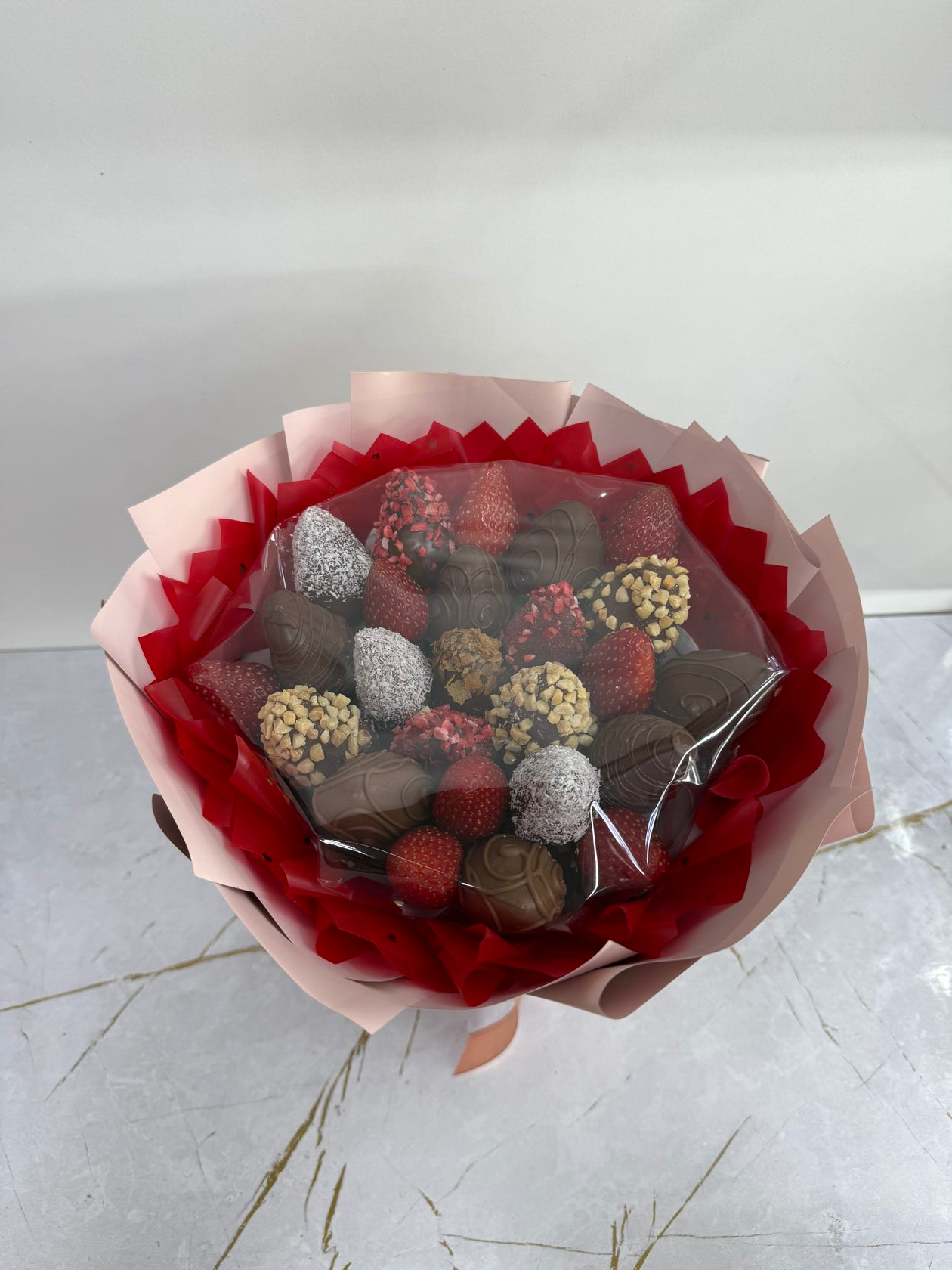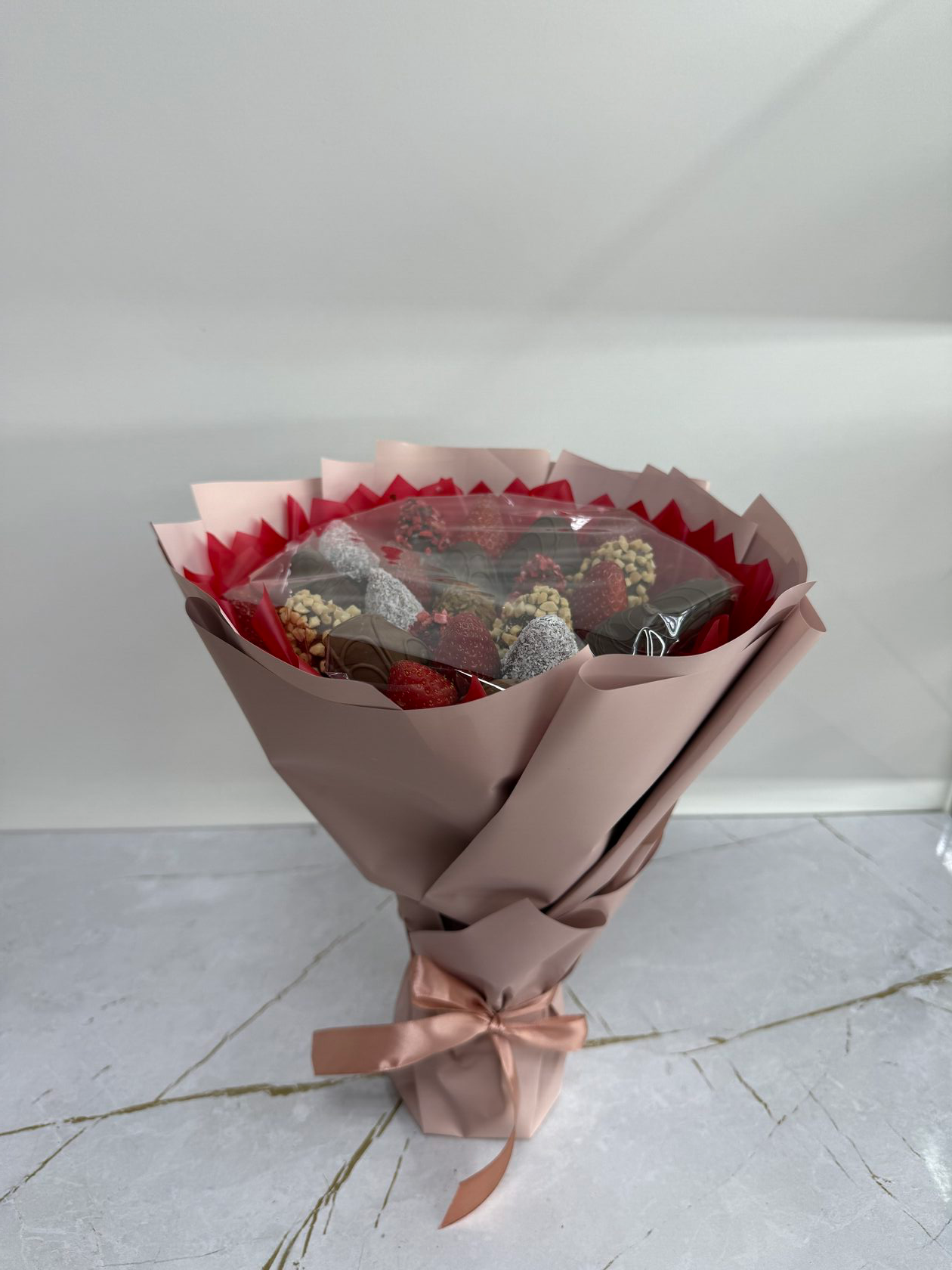 Букет из клубники в белом и молочном бельгийском шоколаде, посыпки из вафельной крошки, клубники, кокосовой стружки, арахиса.