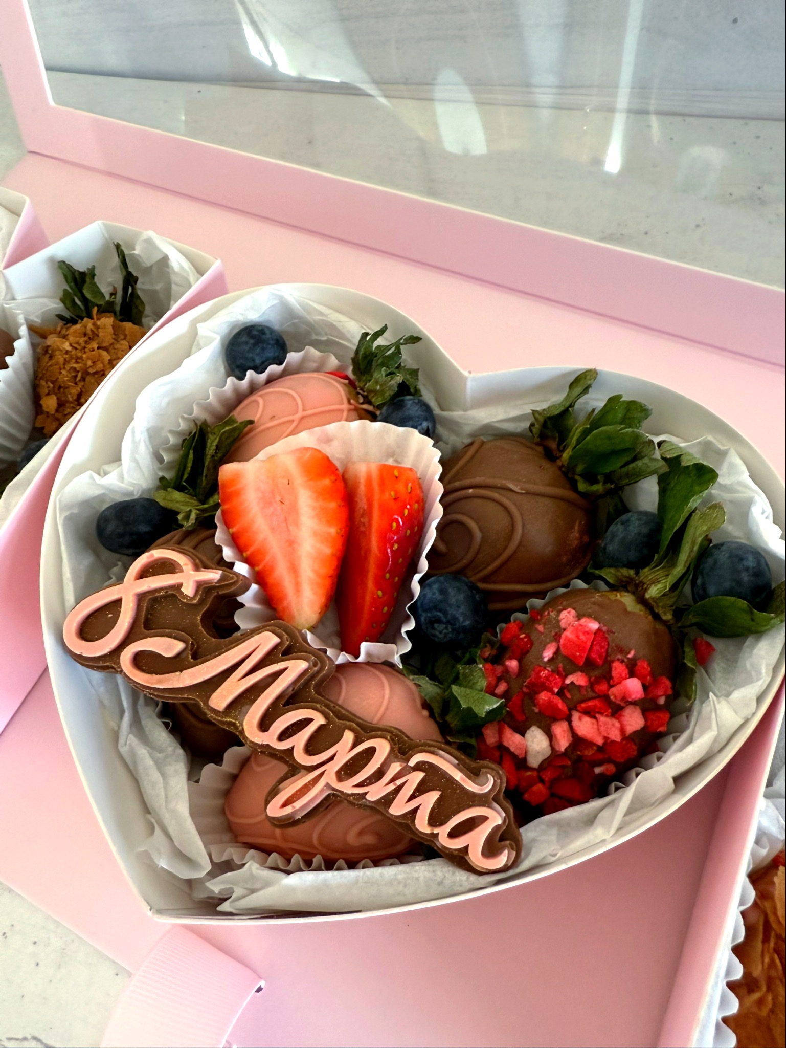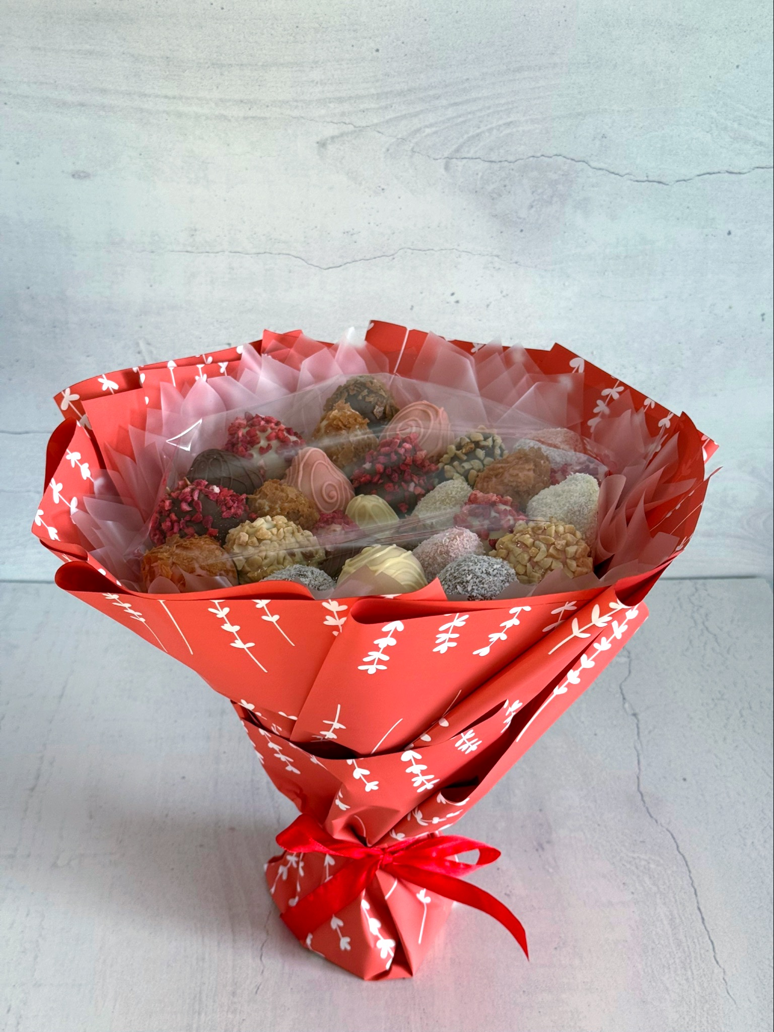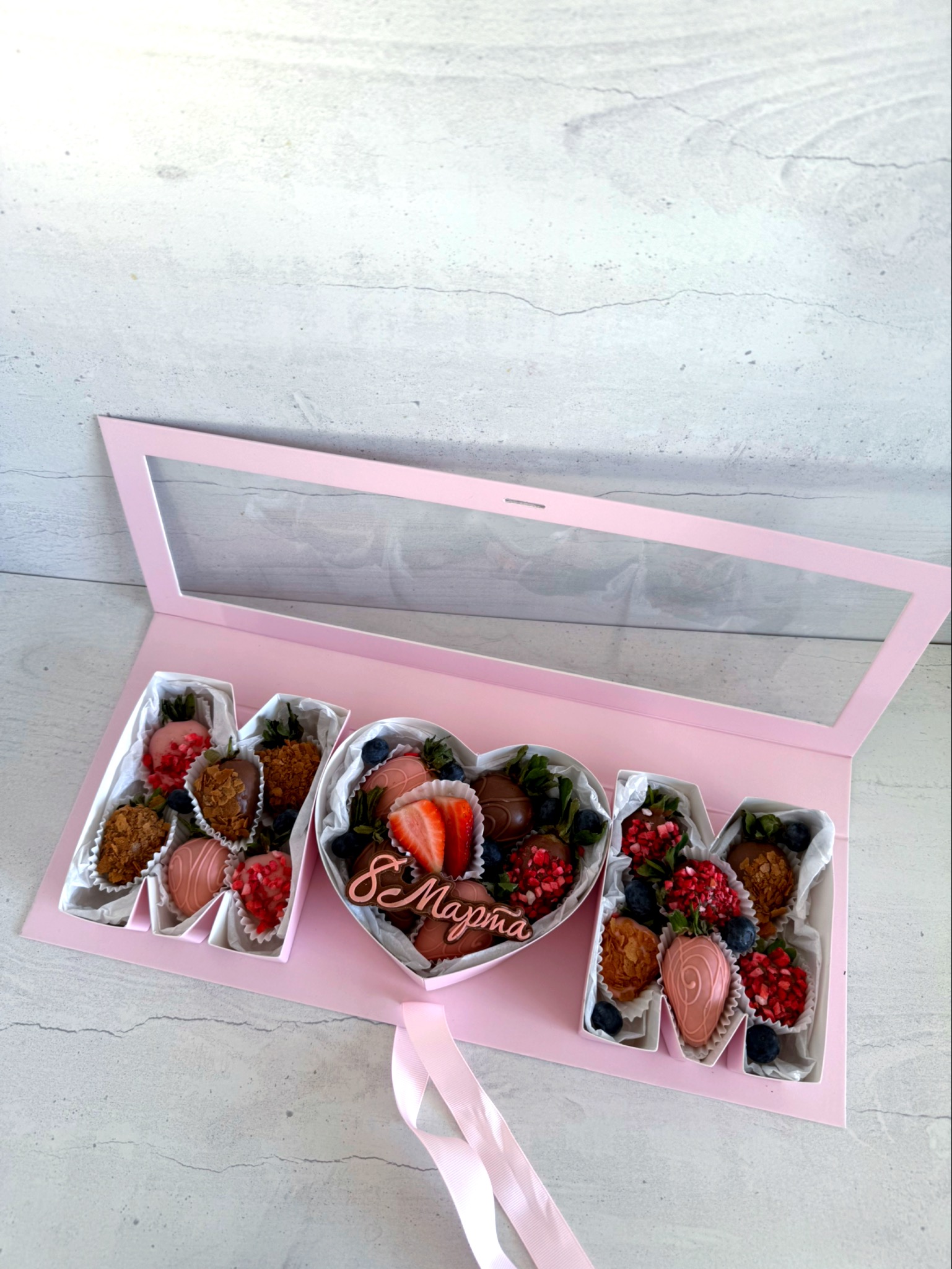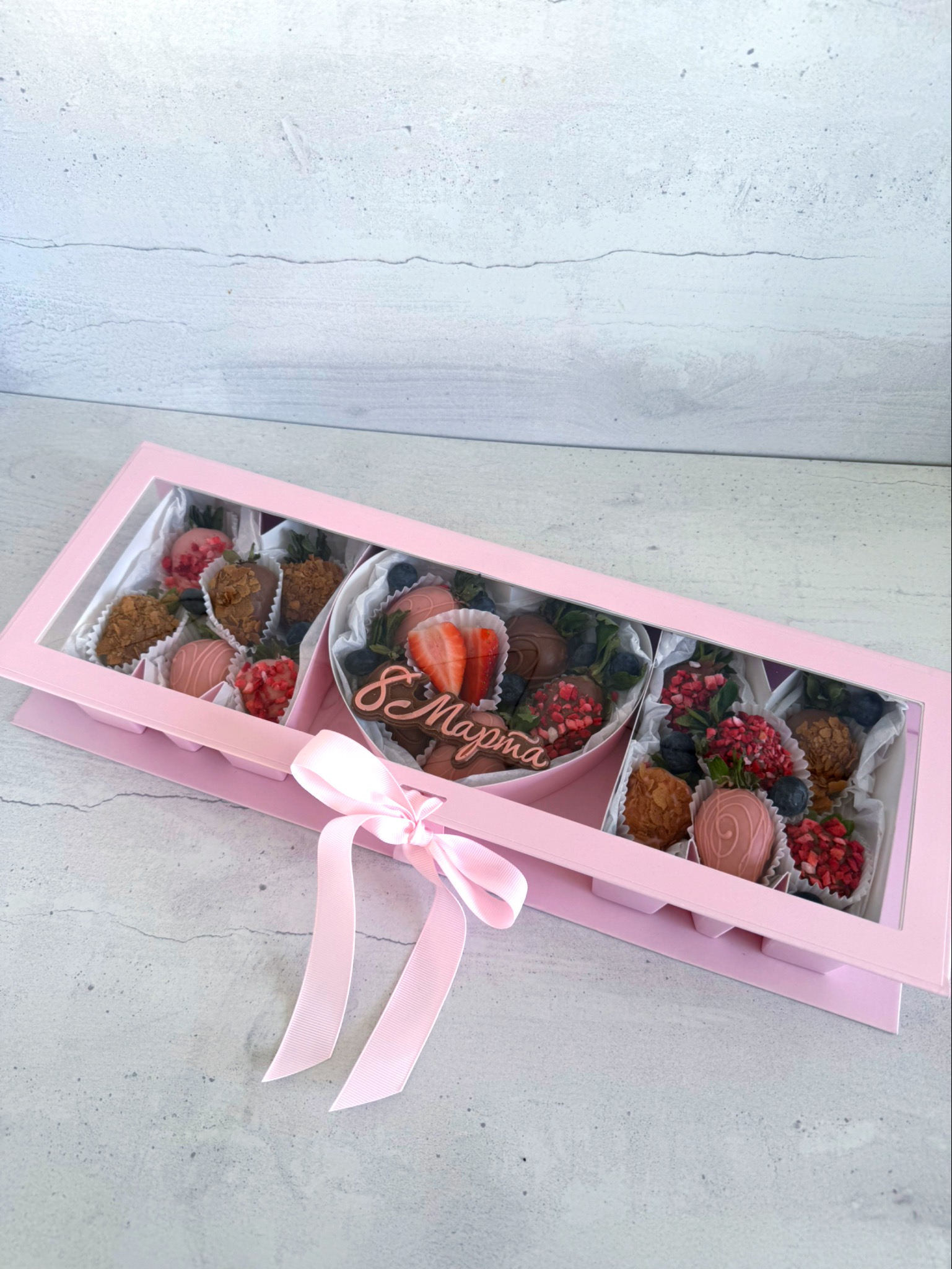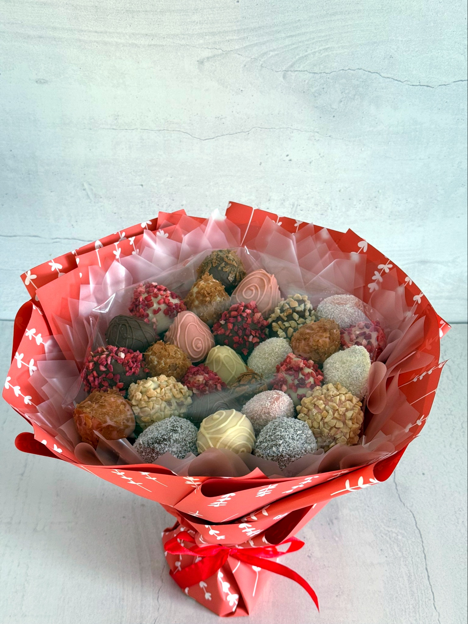 Букет из клубники в белом и молочном бельгийском шоколаде, посыпки из вафельной крошки, клубники, кокосовой стружки, арахиса.